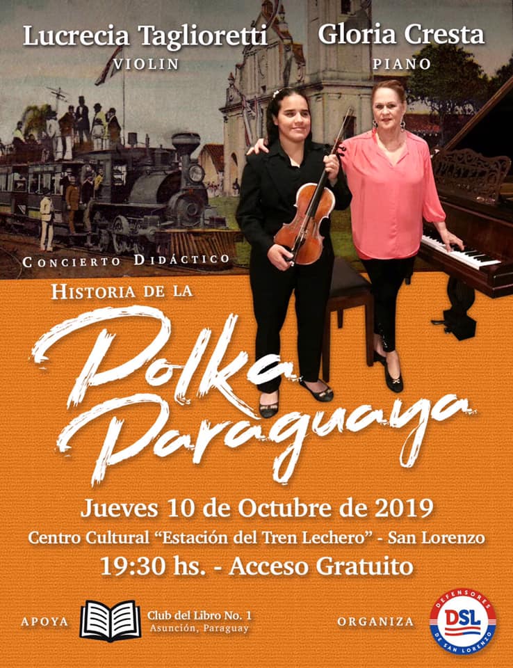 Este Jueves 10 de Octubre se realizará el Concierto Didáctico sobre la Polca Paraguaya, a cargo de la pianista Gloria Cresta y la violinista Ana Lucrecia Taglioretti (Dúo Piolín Milonguero) desde las 19:30 hs. en el Centro Cultural “Estación del Tren Lechero” en la ciudad de San Lorenzo. Toda la ciudadanía está invitada a este evento de acceso gratuito y de interés cultural general.