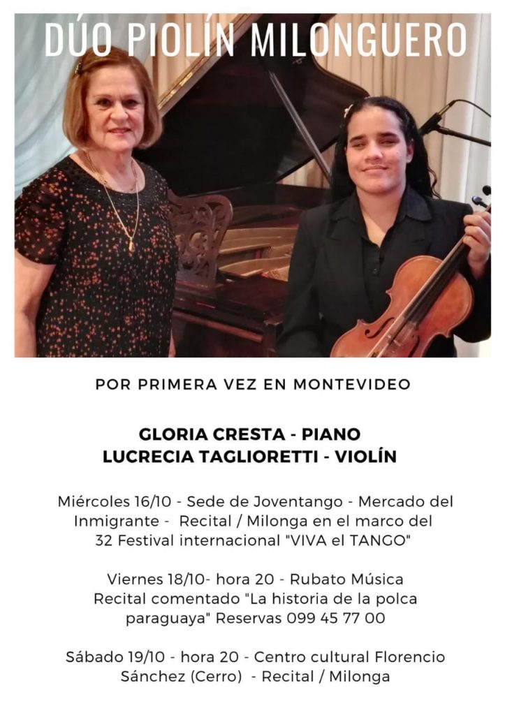 Gloria Cresta y Lucrecia Taglioretti presentan este Concierto Didáctico en San Lorenzo antes de embarcar en una gira del 15 hasta el 21 de Octubre en Montevideo, Uruguay, en donde participarán del 32 Festival Internacional “Viva el Tango” y luego ofrecerán otros 2 recitales, entre los cuales presentarán este mismo Concierto sobre la Polca Paraguaya.